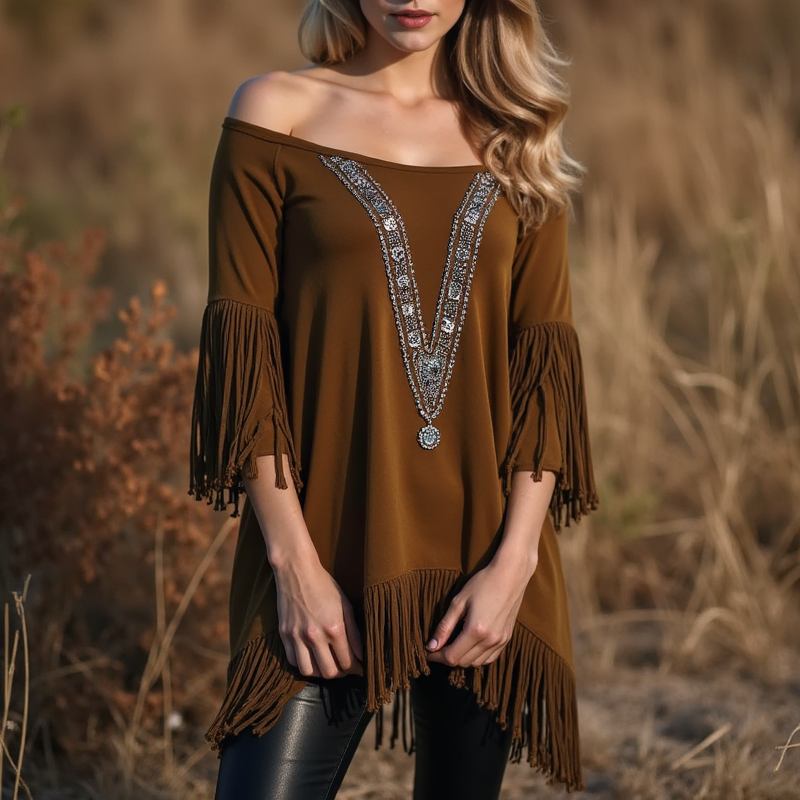 Women's Fringed Lace Off-the-shoulder Elegant Tunic Basic Pullovers Blouse Dressy Tops