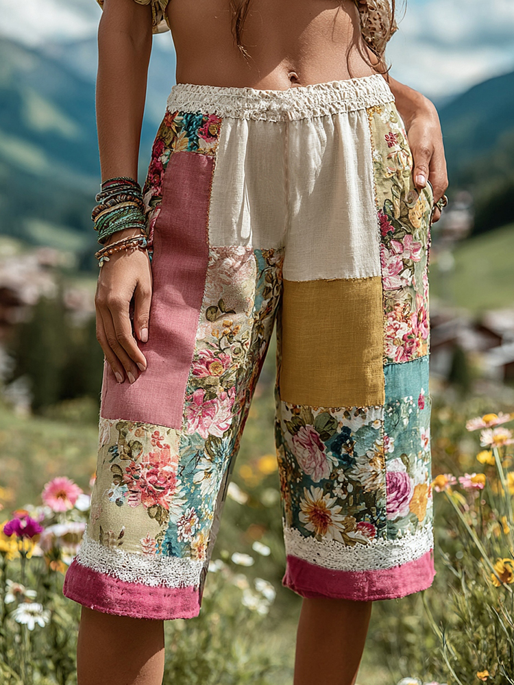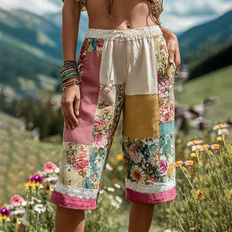 Women's Patchwork Floral Contrast Waist Elastic Pocket Shorts