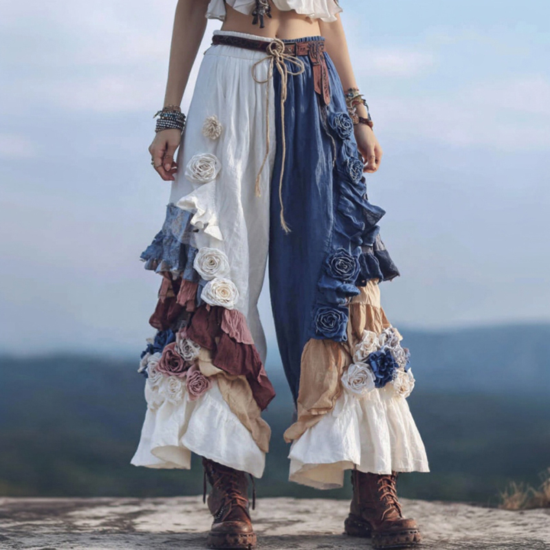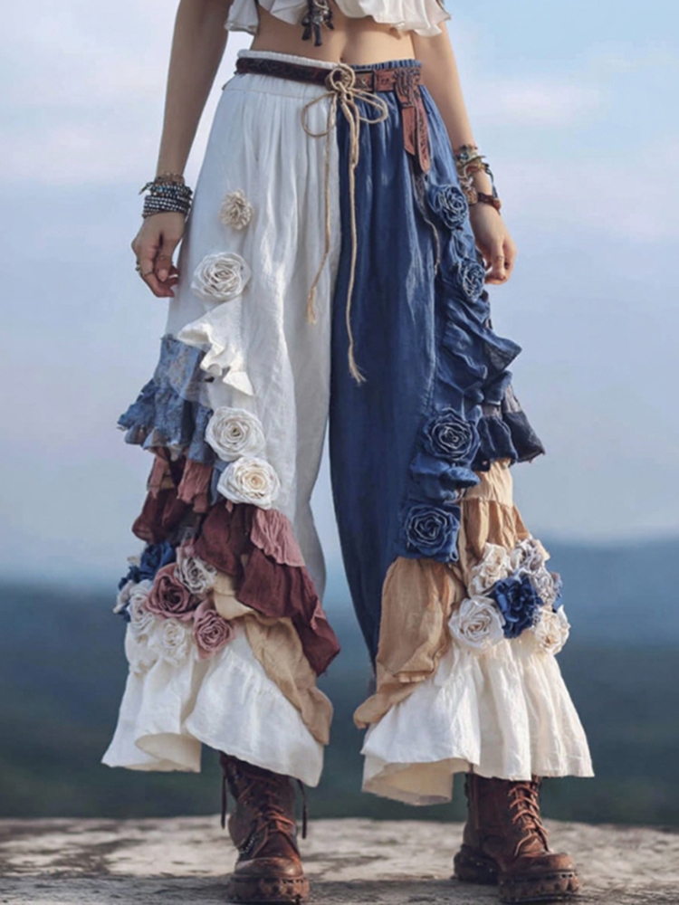 Women's Floral Embroidery Patchwork Art Linen Blend Casual Pants