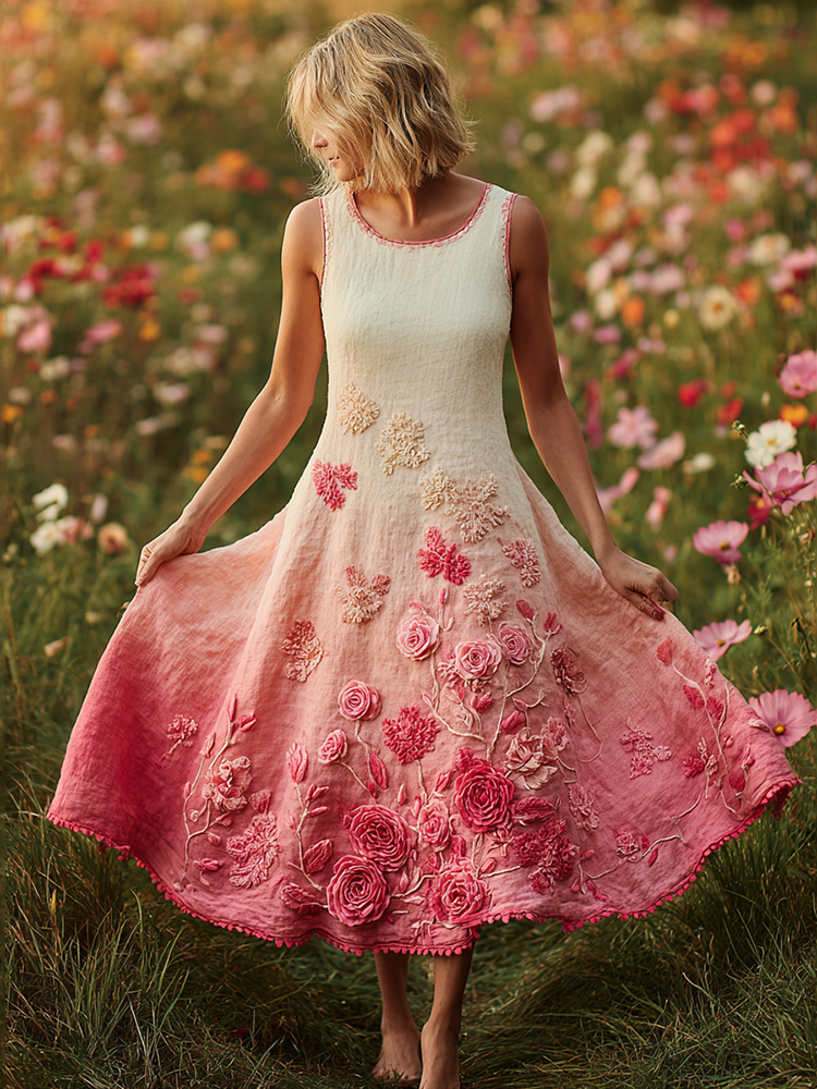 Stylish Pink Floral Embroidered Cozy Linen Tank Maxi Dress