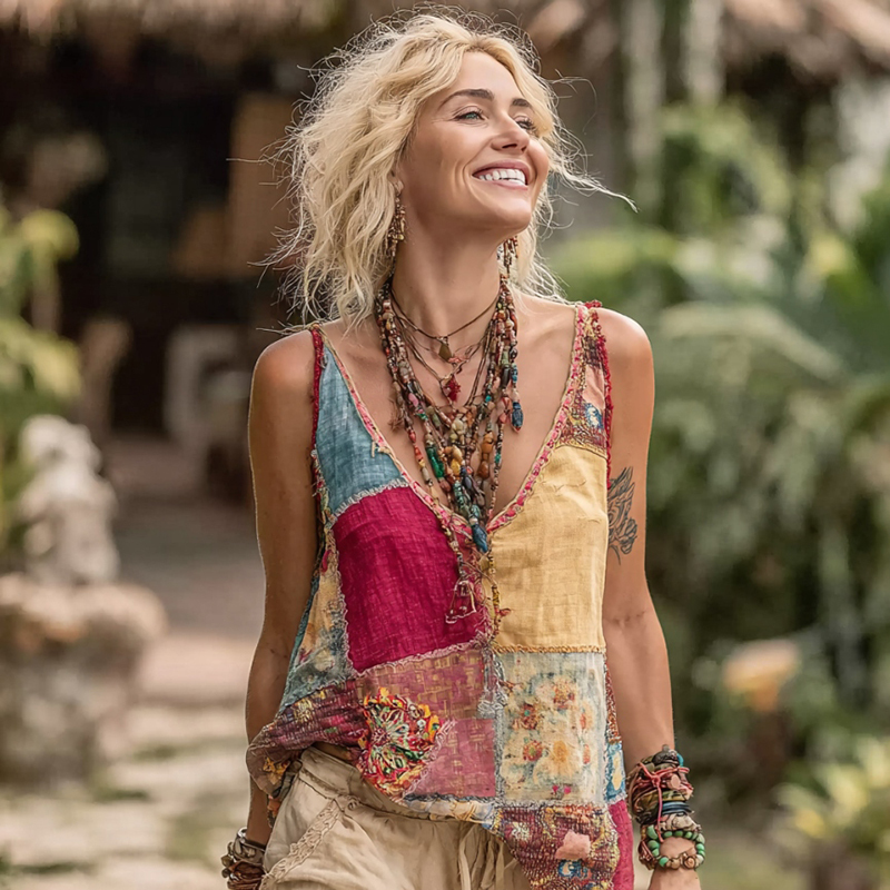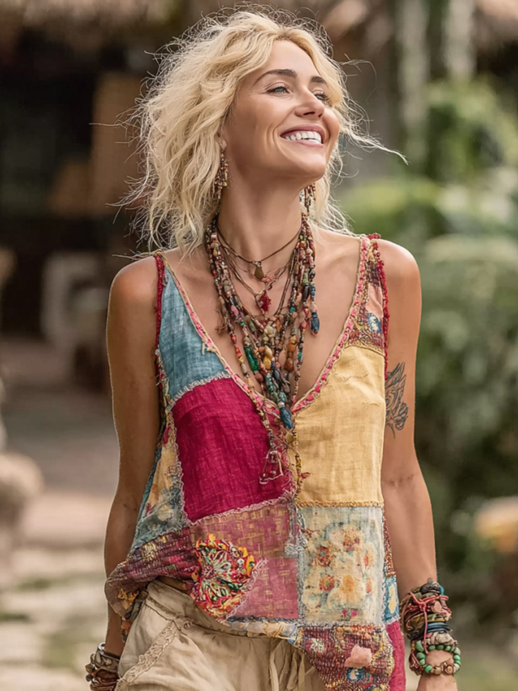 Women Vintage Floral Geometry Art Linen V Neck Tank Top