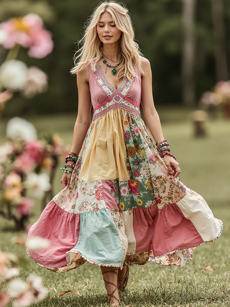 Women Vintage Pink Floral Patch Art V Neck Linen Maxi Dress