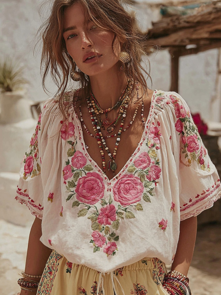 Women's Pink Rose Embroidered V-neck Linen Blend T-shirt