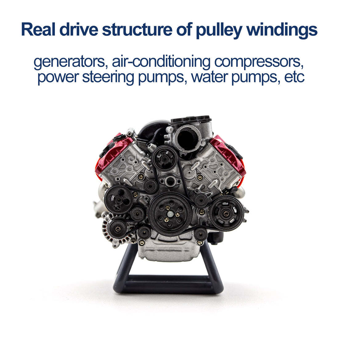 RC Full Simulation Engine: V8 internal combustion engine structural principle design, drive structure of belt wheel winding, generator, air conditioning compressor, steering pump, water pump, complete output flywheel and layered cylinder head, cylinder head cover, spiral near and far valve intake manifold, oil pan structure, and power supply drive board plug interface.
