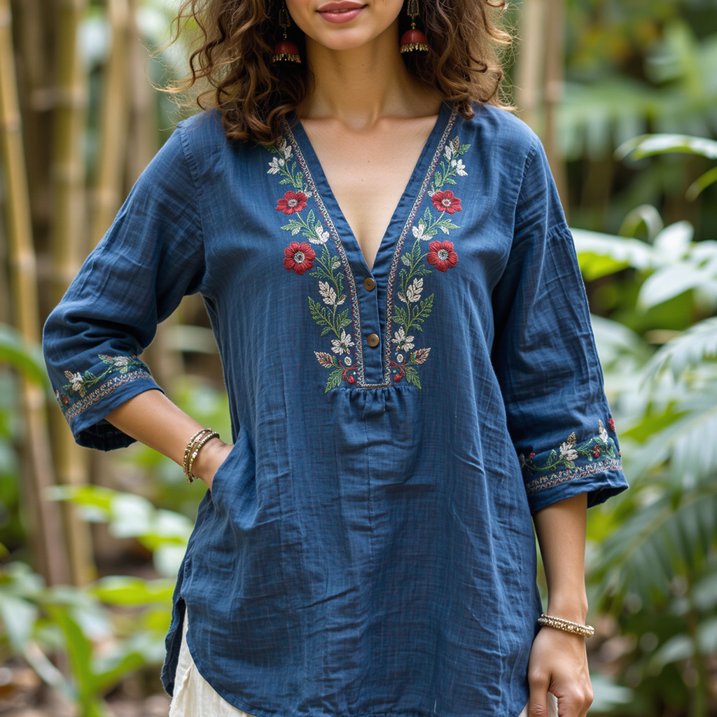 Women's New Casual Embroidery Printed Cotton And Linen Loose Shirt